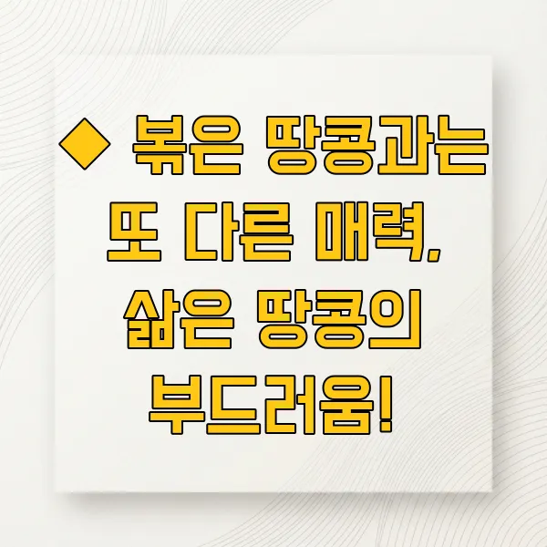 반면 삶은 땅콩은 부드럽고 촉촉한 식감으로, 짭짤한 맛이 더해져 입이 심심할 때 먹기 아주 좋답니다. 특히 껍질째 삶으면 씹는 재미도 더해져서 아이들도 무척 좋아해요.
