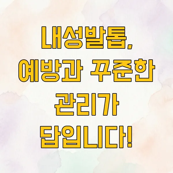 가장 좋은 것은 내성발톱이 생기지 않도록 예방하는 것이겠죠! 발톱을 항상 일자로 깎고, 발에 편안한 신발을 신으며, 발톱에 무리가 가지 않도록 주의하는 습관을 들여보세요. 만약 이미 내성발톱으로 고생하고 계신다면, 너무 좌절하지 마시고 오늘 알려드린 정보들을 참고해서 꾸준히 관리해나가시길 바랍니다. 건강한 발톱으로 편안한 일상을 되찾으시길 응원할게요!